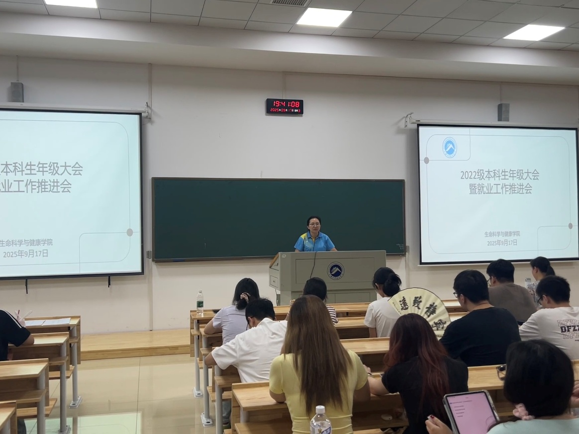 为扎实推进2022级本科生毕业季学业规划与就业指导工作,9月17日晚7点半,我院于敏行楼C512召开年级大会暨就业工作推进会。会议由2022级辅导员易临群主持,学院党委副书记舒艳出席并讲话,全体2022级本科生参会。
