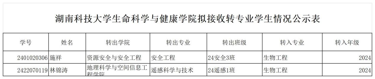 根据《湖南科技大学普通全日制本科生转专业管理办法(试行)》(科大政发〔2024〕81号)和《17c爆料吃瓜转专业管理办法》(院发〔2024〕38号)等文件精神,经学生本人申请、转专业工作领导小组面试、教务办审查,拟同意施祥、林锦涛2名同学由外院转入我院生物工程专业学习。现将转专业名单进行公示。