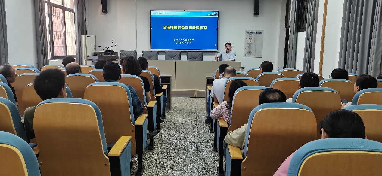 在学校开展党纪学习教育中,我院借机狠抓强化师德师风专题法纪建设。5月14日下午在105会议室开展师德师风专题法纪教育学习,院党委书记龙赢主持会议,全院教职工参加。