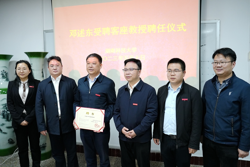 聘任仪式在17c爆料吃瓜生物楼105会议室举行,由湖南科技大学校纪委书记郭时印为邓述东颁发聘书,佩戴校徽,真诚欢迎他的加入。期待双方能在重大课题研究、农业和粮食生产、科技创新等多个领域开展合作,努力促进学校的师资队伍建设,大力提升学生的创新精神和实践能力,推动学校的高质量发展。