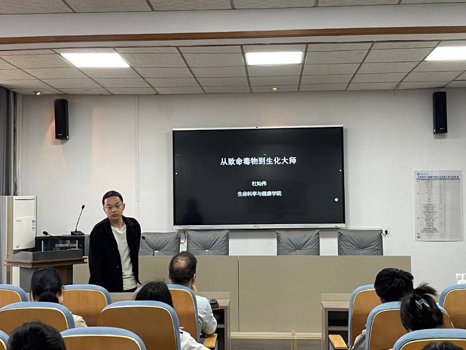 杜灿伟博士以“从致命毒物到生化大师”为题,介绍了自然界中的有毒生物及其生存策略,并且进一步讲解了科学家对有毒生物的毒液的开发和利用,列举了多种由毒液开发而来的药物作为案例进行介绍,引起了师生的广泛兴趣。