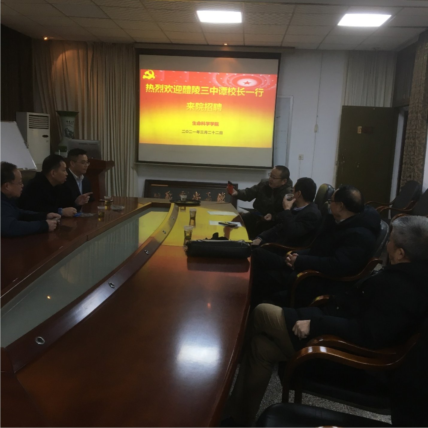 2021年3月23日上午10点,醴陵三中校长谭世明、副校长杨毅鑫等一行来校招聘。院长王海华、副院长周定港、生物科学系谭立军、易俗、刘文海、学院就业干事王宏冀等老师在学院105会议室座谈。湖南科技大学本科教学督导团副团长李建生教授一起参加。