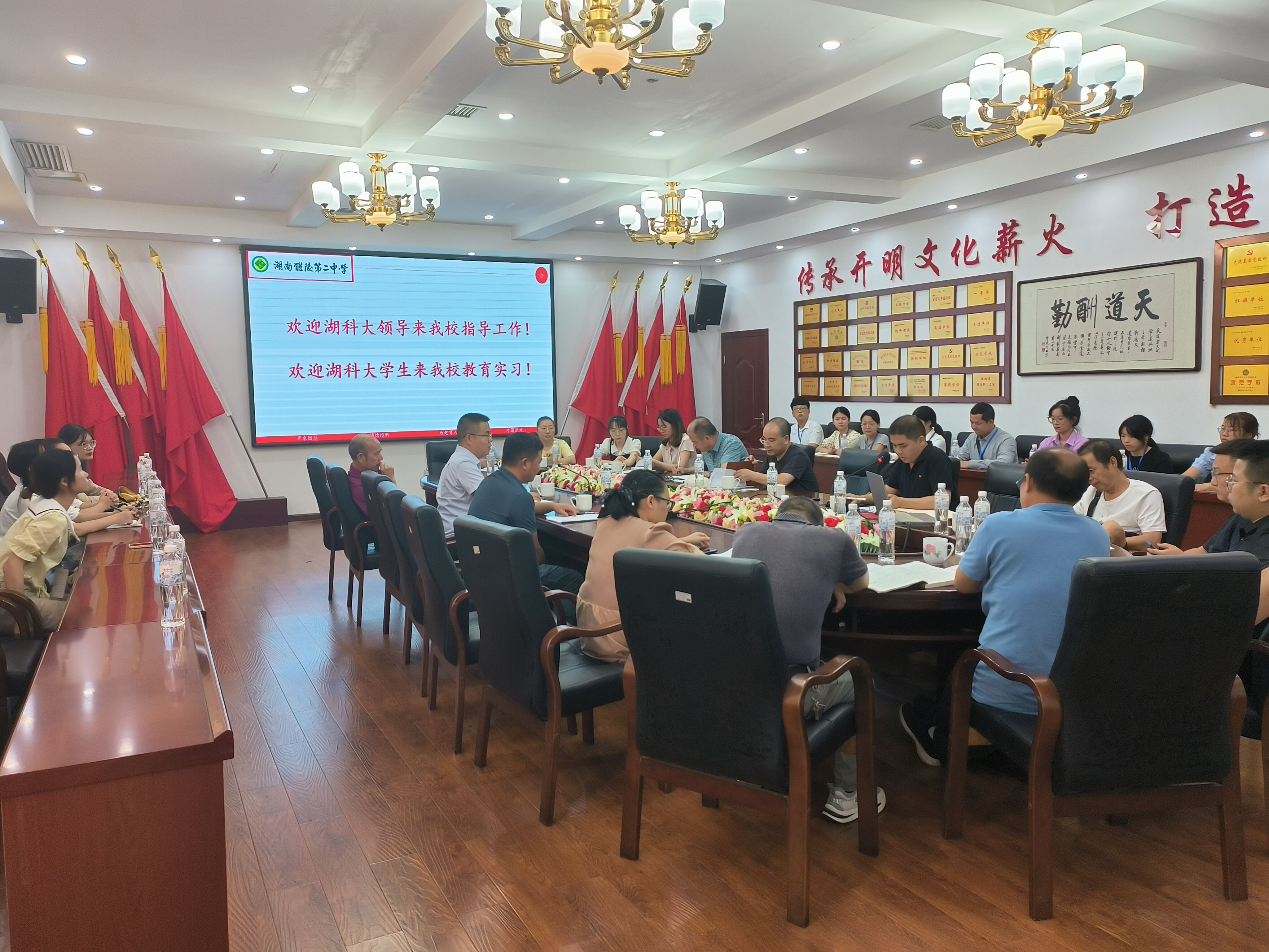 在醴陵二中,汤雪斌副校长致欢迎辞,教务主任陈海波具体安排。我院周定港副院长介绍了我校和我院生物学师范教育的历史和优势,回顾与醴陵二中的实习合作历史,对醴陵二中长期以来的支持表达感谢,同时对实习队师生提出要求。张继红主任、谭新中老师和实习队尹景欢同学分别做表态发言,表示严格遵守双方纪律、预祝实习取得圆满成功。