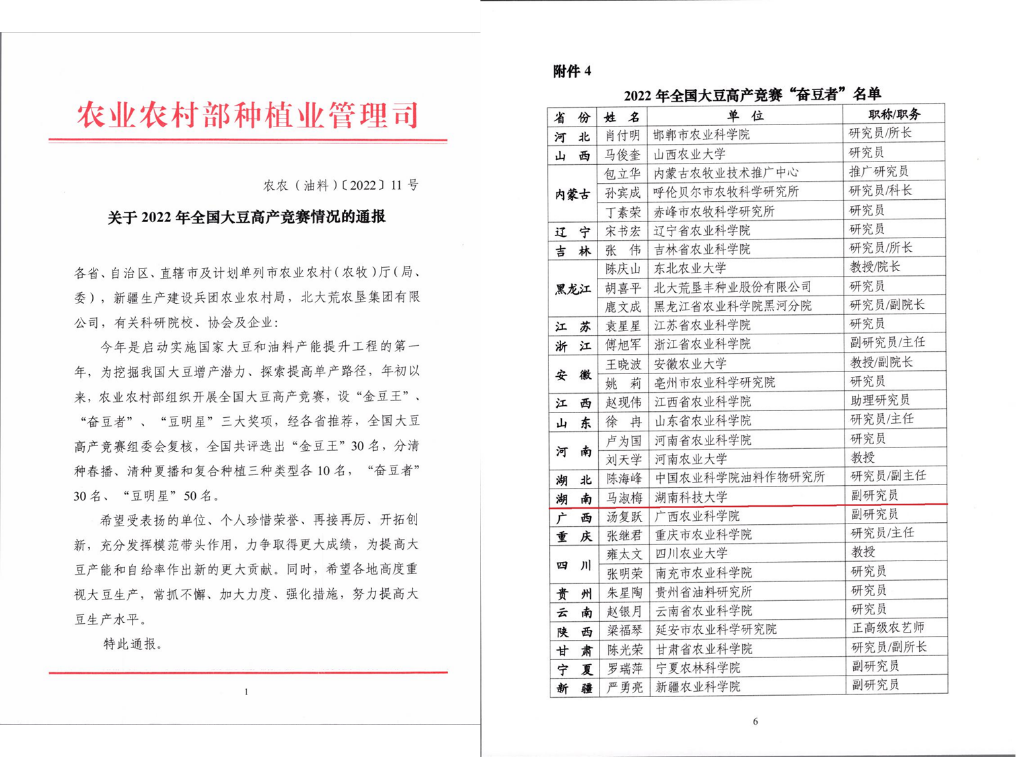 12月30日,农业农村部种植业管理司发布了《关于2022年全国大豆高产竞赛情况的通报》,我院马淑梅副教授(原副研究员)荣获“2022年全国大豆高产竞赛“奋豆者”奖项。